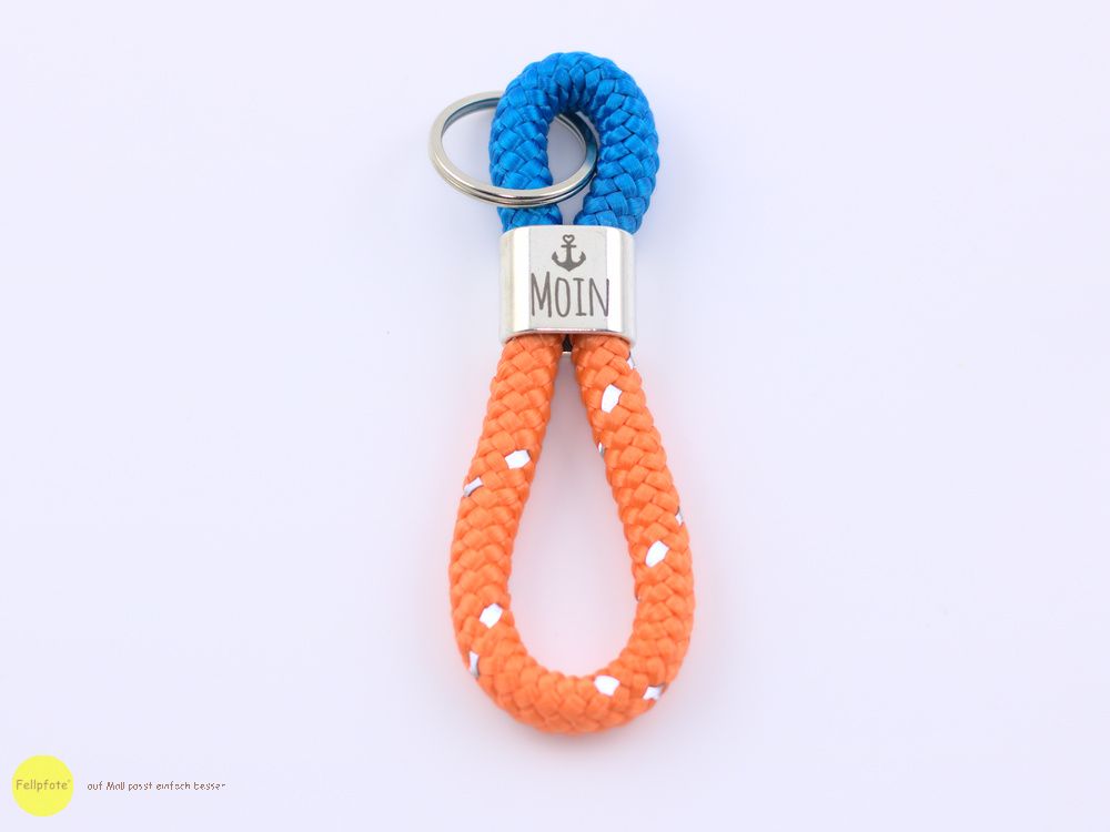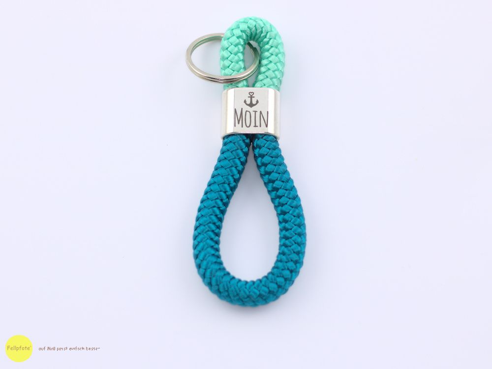 Das Zwischenstück mit der Gravur "Moin" ist versilbert und hat die Maße 20 x 24 mm. Kombiniert haben wir diesen Anhänger mit einem 10 mm Segelseil in verschieden Farbausführungen. Insgesamt ist der Schlüsselanhänger ca. 12 cm lang - gemessen ohne Ring. Der Schlüsselring ist aus Edelstahl.