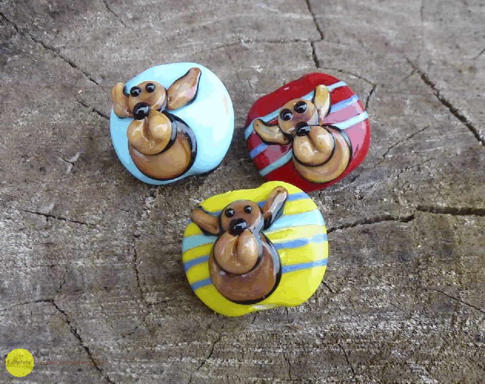 In liebevoller HANDARBEIT werden diese süßen Linsen aus Muranoglas am Brenner geformt und im Ofen getempert. Auf der Vorderseite sind die Glaslinse mit einem niedlichen Hund verziert, auf der Rückseite ist die Rute zu sehen. Es sind UNIKATE und etwas ganz BESONDERES.