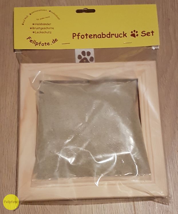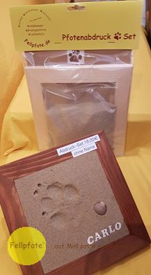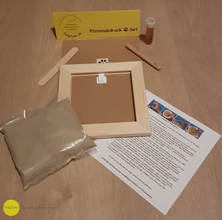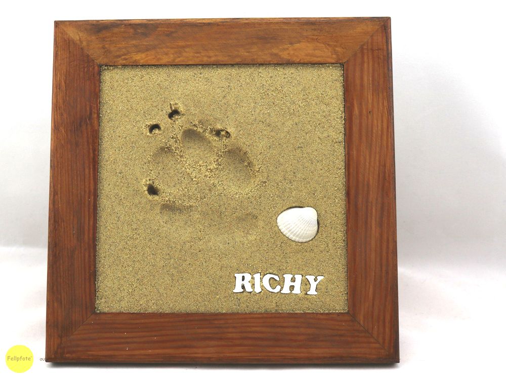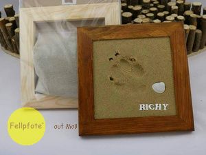 Ganz einfaches gestalten eines wasserfesten Pfotenabdrucks. Die Pfote in das Sand-Kleber-Gemisch eindrücken und 24 Stunden trocknen lassen. Die Masse ist gesundheitlich unbedenklich und kann 60 Minuten lang bearbeitet werden. Der Rahmen ist Kiefernatur und kann farblich gestaltet werden. Der Fantasie sind keine Grenzen gesetzt. Muschel und Buchstaben sind im Lieferumfang nicht enthalten!